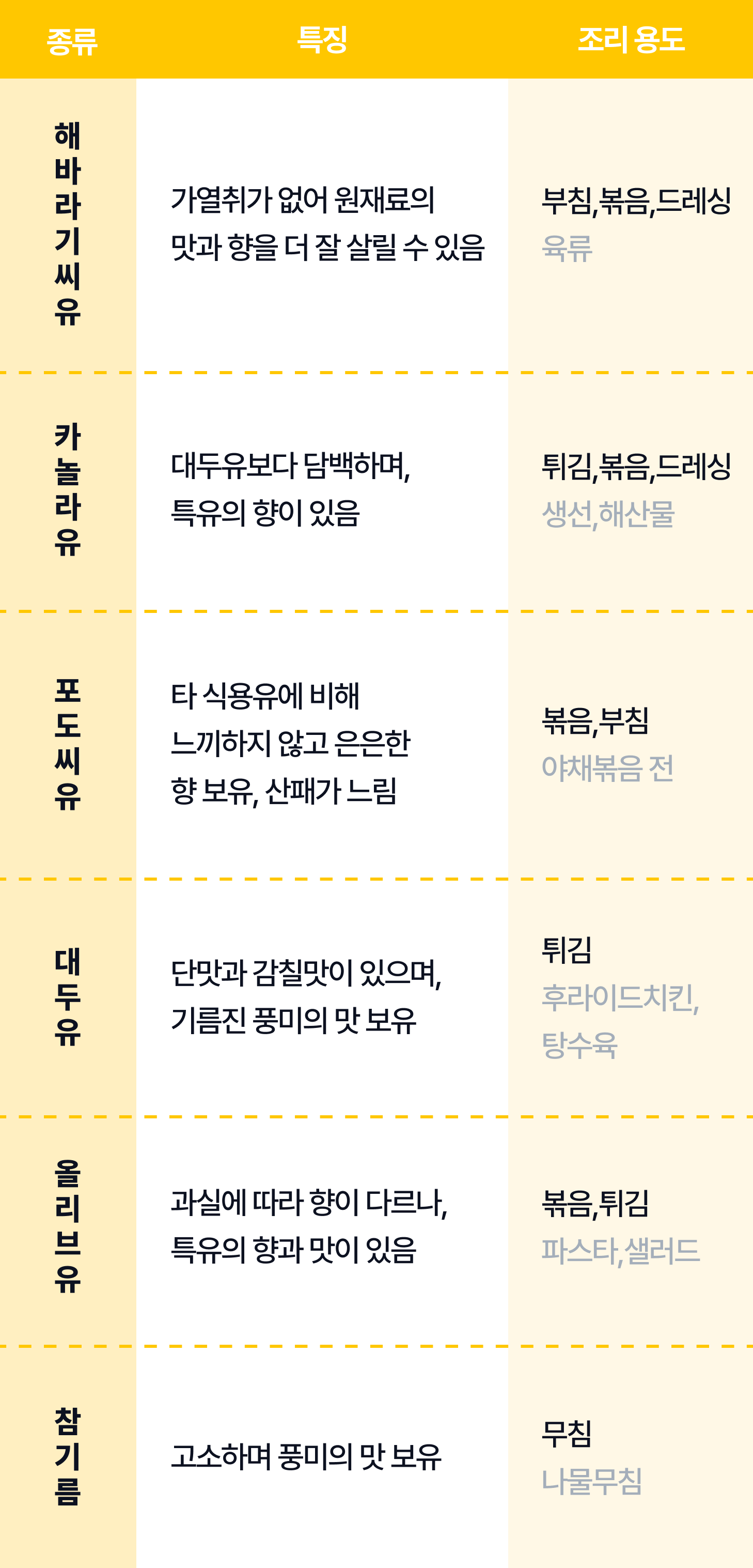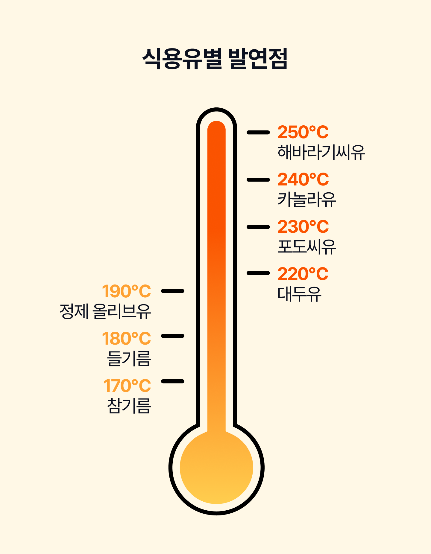 해바라기씨유, 올리브유, 참기름/들기름까지, 발연점에 따라 식용유도 종류가 많죠. 우리 가게 메뉴에 맞는 식용유를 쓰고 있는지 체크해보세요.