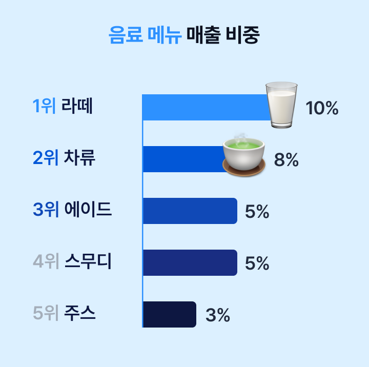 비 커피류 음료 중에서는 라떼와 차가 매출을 견인하는 비율이 높았어요. 특히 그 중에서도 차류의 성장세가 눈에 띄고 있는데요!