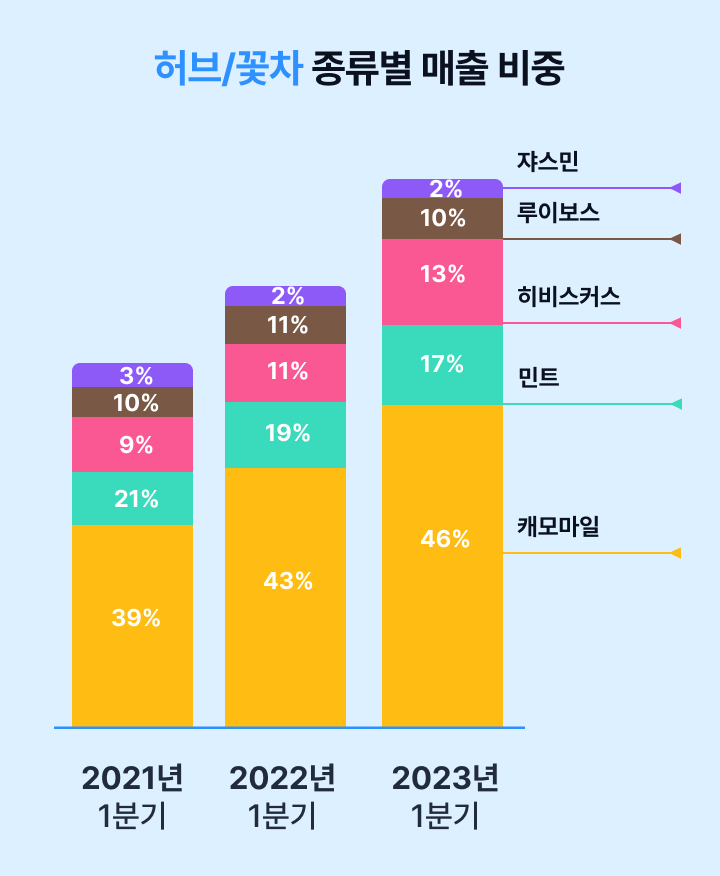 그중에서도 캐모마일과 히비스커스티의 매출 비중의 성장이 눈에 띄었습니다.