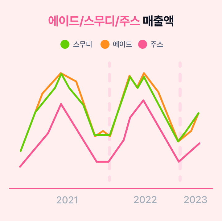 마지막으로, 에이드・스무디・주스를 살펴볼게요. 에이드・스무디・주스 경우 매출의 큰 변화는 없지만 과일이 포함된 음료를 중심으로 세 가지 음료 공통되게 전년 동기 대비 2023년 1분기에는 조금씩 매출이 상승했습니다.