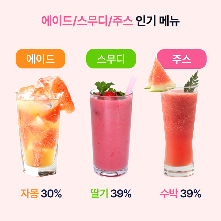 에이드의 경우 자몽, 스무디는 딸기, 주스의 경우 수박이 가장 인기가 많으니 이 점 참고하셔서 다가오는 여름, 신선한 과일 메뉴를 한 번 준비해보시는 건 어떠세요?