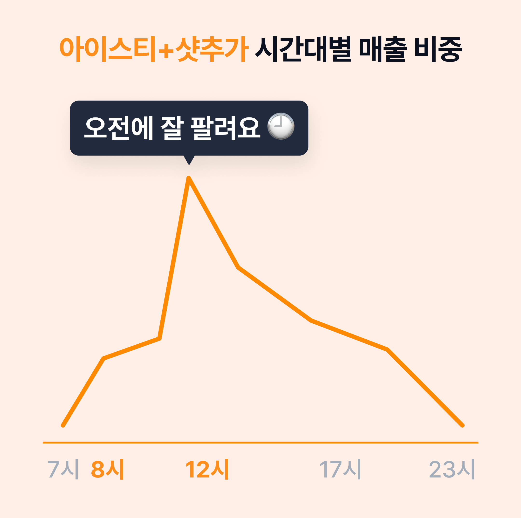 특히 기본 아이스티는 12시 이후에 매출 비중이 15시가지 꾸준히 유지되어 점심을 먹은 후에 찾는 음료로 소비되고 있어요.