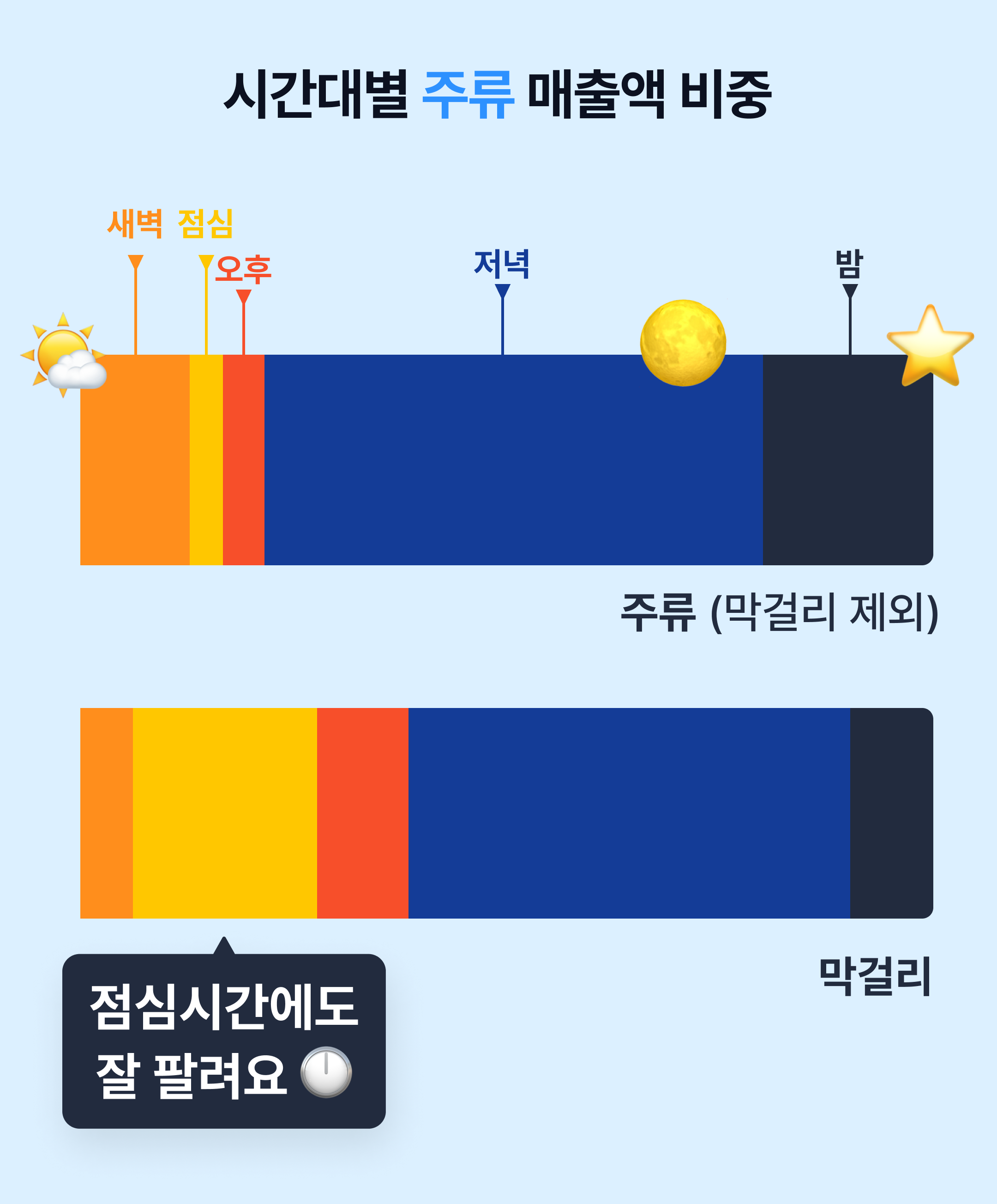 특이한 점은 타 주류 대비 점심 시간의 매출 비중이 높다는 점인데요. 이는 막걸리를 반주로 섭취하는 수요 때문으로 보입니다. 저녁부터 새벽 사이에 많이 소비되는 다른 주류와는 확연한 차이가 있습니다.