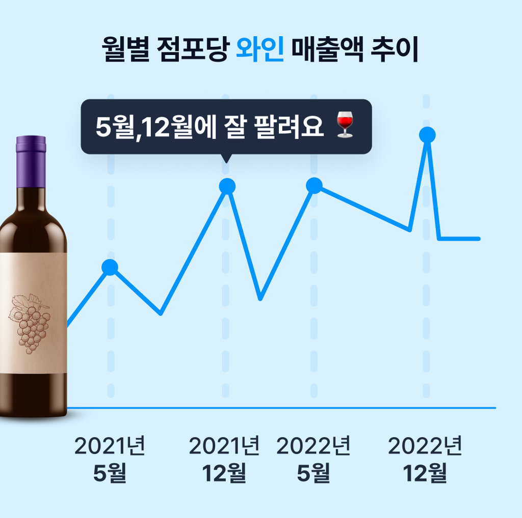 와인은 특정 달에 매출액이 크게 증가하는 특징이 있는데, 언제일까요? 정답은 파티와 모임, 휴일이 많이 몰려있는 12월과 5월입니다! 그래프에서도 22년 12월이 매출 최고점, 그다음 5월 순으로 높다는 점을 알 수 있습니다.