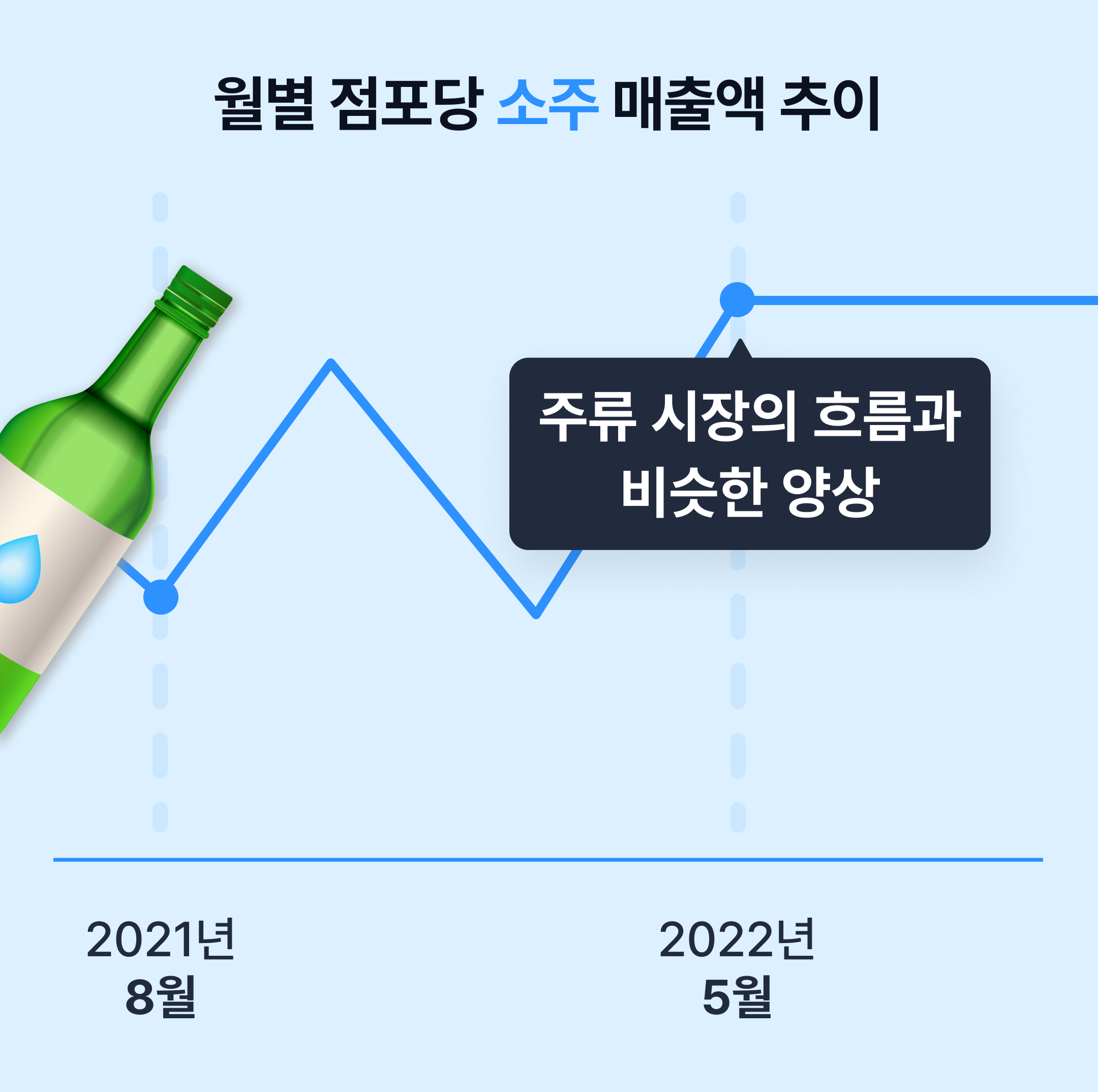 소주는 '국민 술'이라 불리기 때문일까요, 매출액도 전체 주류시장의 흐름과 유사한 양상입니다. 마찬가지로 거리두기가 해제된 후 소주의 매출액은 빠르게 늘어났고, 그 수준을 유지하고 있습니다.