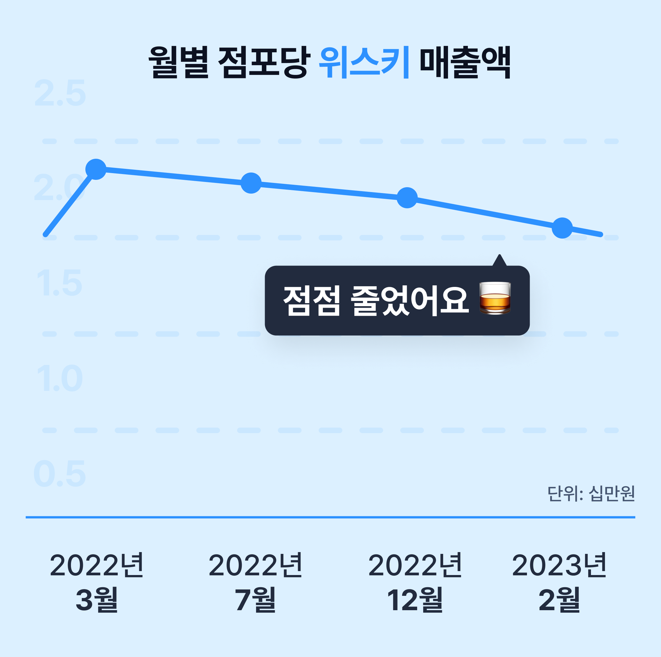 그 트렌드를 증명하듯 2023년부터 위스키 매출액은 줄어드는 한 편, 하이볼의 매출 비중이 늘어나고 있네요! 각 증류주별로 하나씩 살펴볼까요?