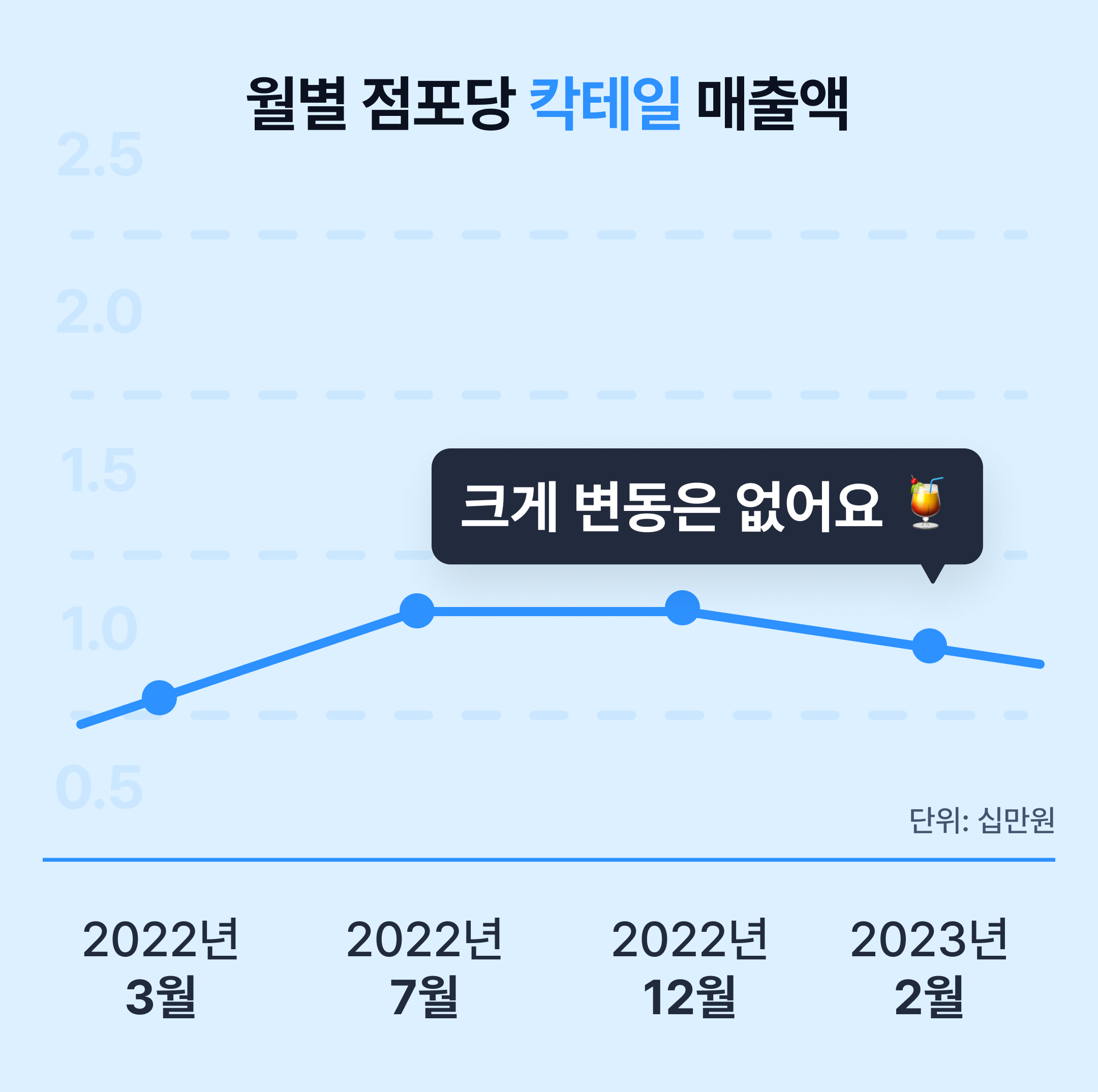 반면, 혼합주의 원조! 칵테일은 하이볼의 성장세에도 불구하고 매출을 일정하게 유지하고 있습니다.