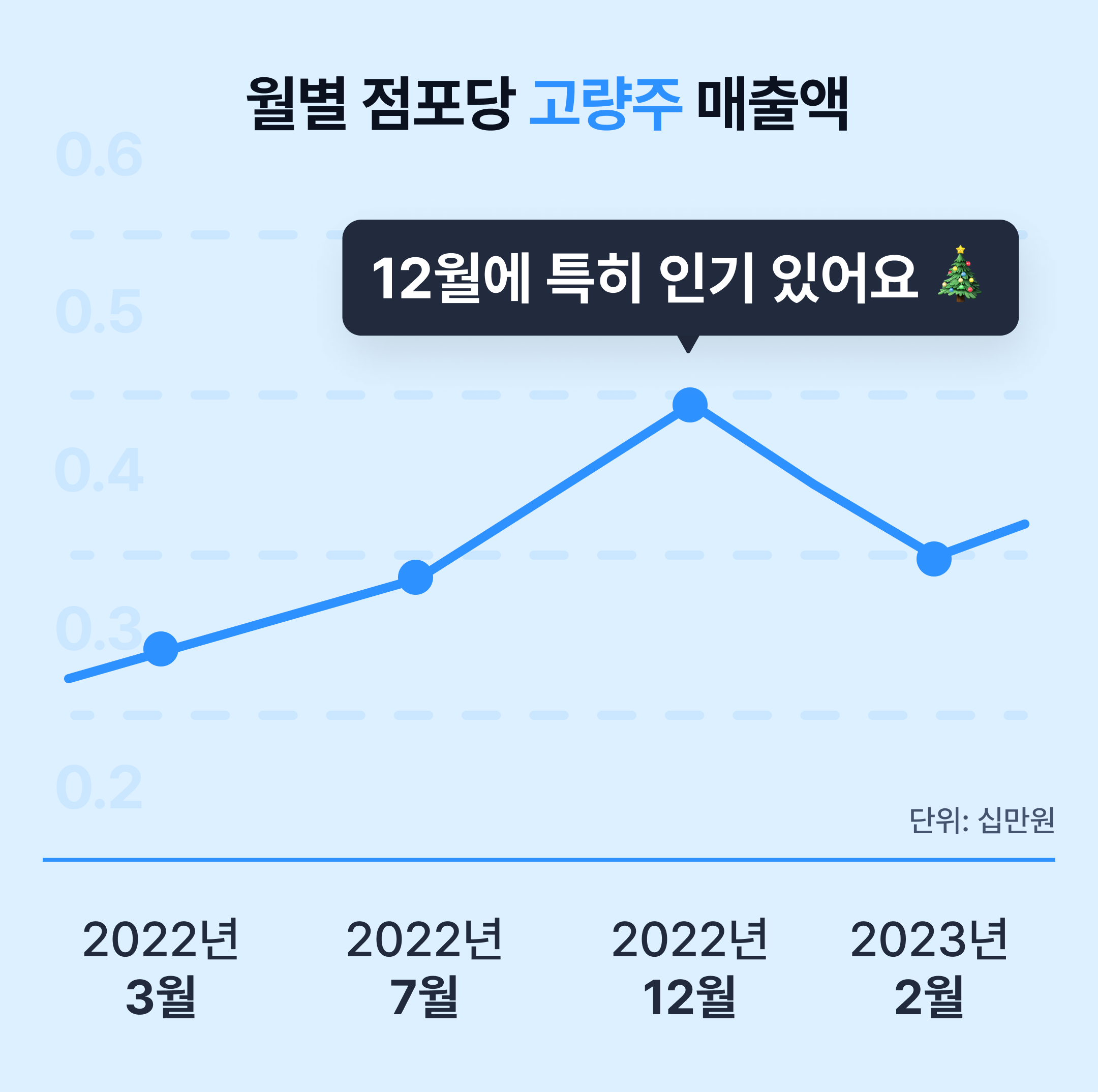 증류식 소주와 비슷하게 고량주도 파티가 많은 12월의 매출액이 크게 증가하는 모습입니다.