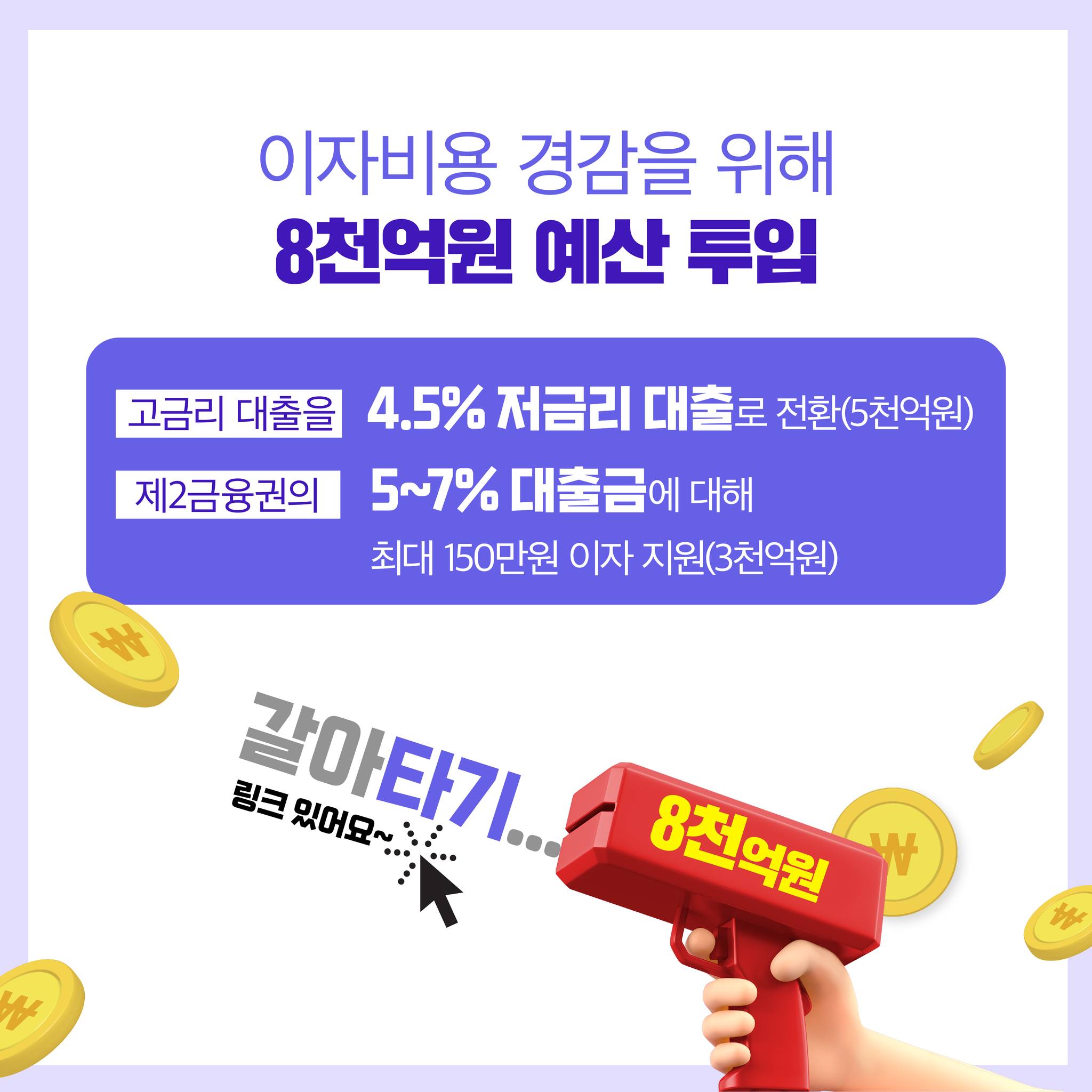 지원 대상 제2금융권에서 5~7% 금리의 대출을 이용 중인 소상공인·자영업자 지원 내용 기 납부한 이자액 대상 최대 150만 원 캐시백 지원 지원 조건 대출금 1억 원 한도, 최대 1년간 납부이자 중 5% 초과 이자납부액 지원(최대 1.5%p) | |