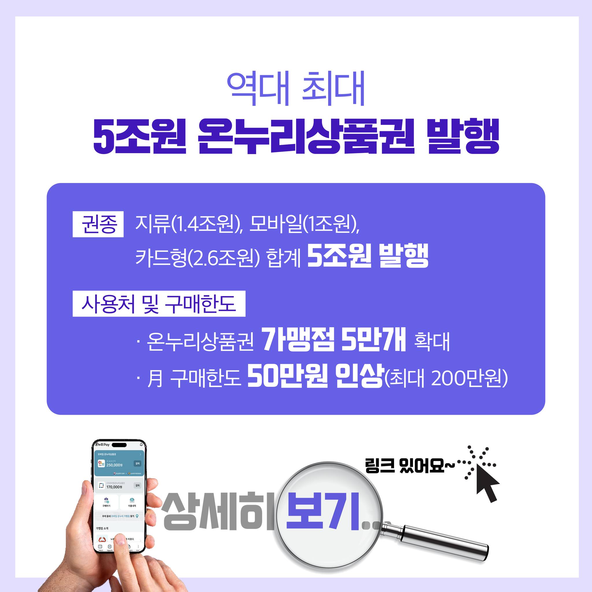 발행 규모 '23.4조 원 ➡️ '24. 5조 원 발행권종 지류(5천원‧1만원‧3만원), 모바일(5천원·1만원·3만원·5만원·10만원), 충전식 카드형 |
