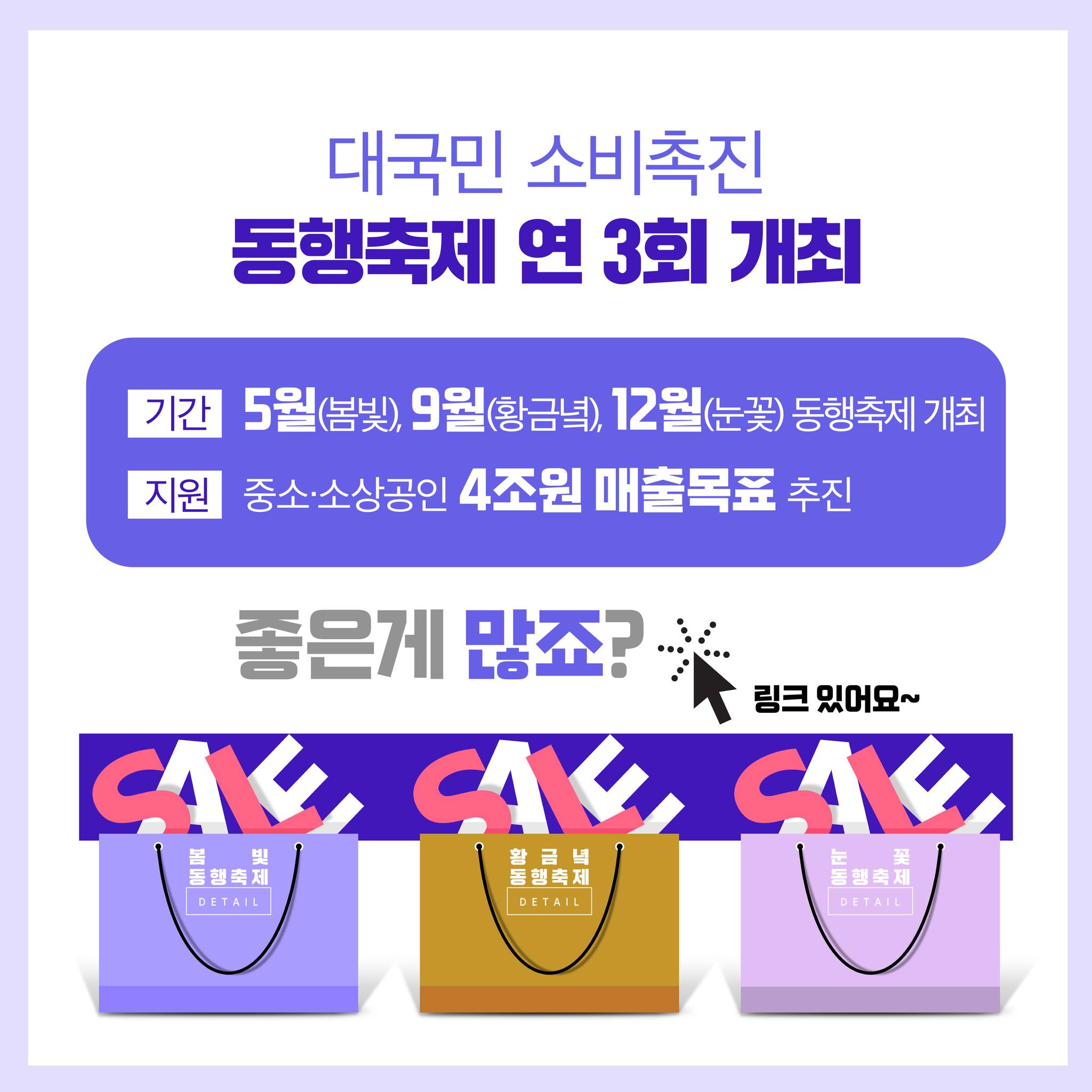 행사개요 중소‧소상공인 등 내수 활성화를 위해 연 3회 온‧오프라인, 대‧중소플랫폼이 함께 하는 대규모 소비촉진 행사 행사 일정 5월(봄빛), 9월(황금녘), 12월(눈꽃) 스케일업 지역축제 및 해외시장과 연계하여 행사규모 확대 |