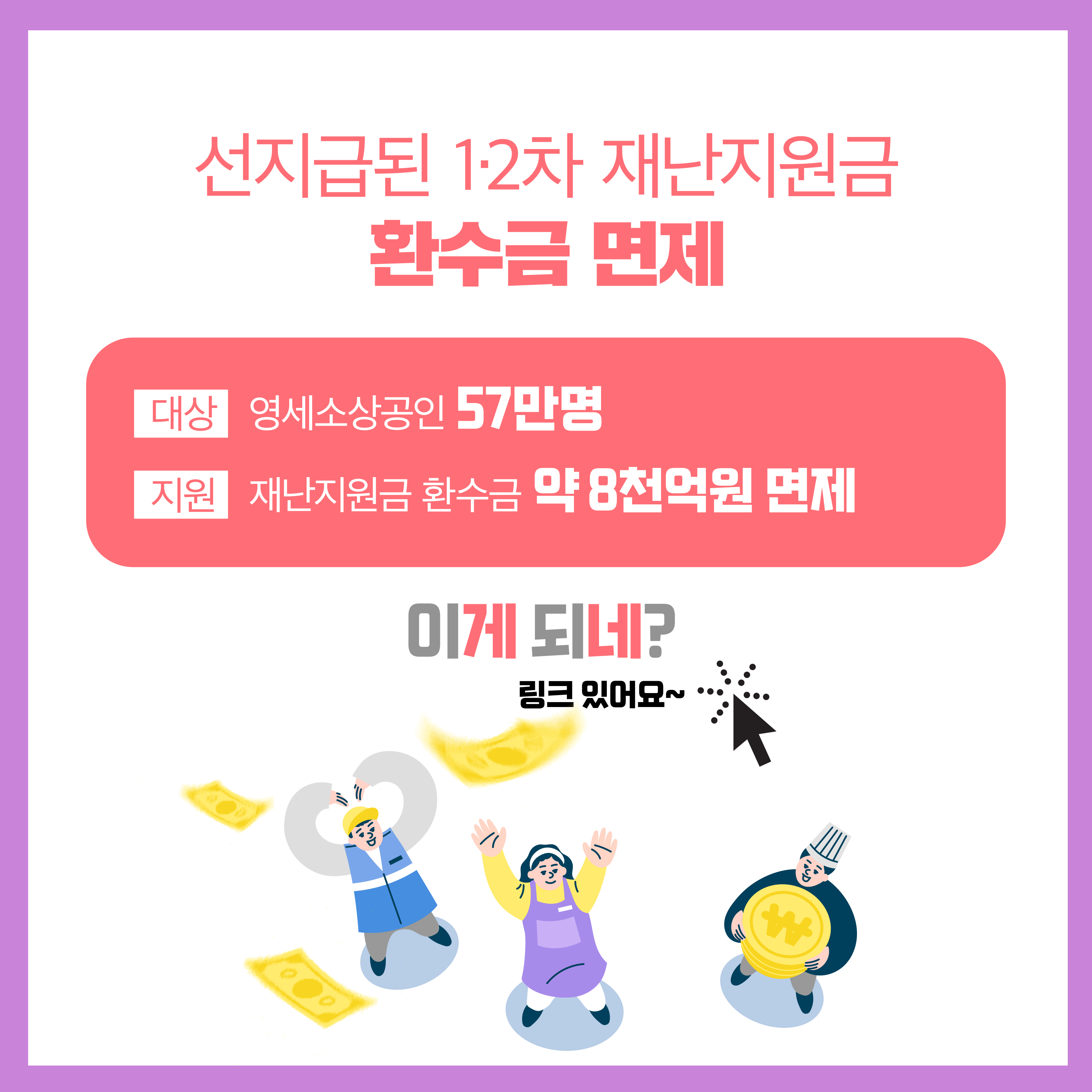 면제 사유 1️⃣ 환수대상이 대부분 영세 간이과세자로, 고금리 등 어려운 경영환경 지속 2️⃣ 지급 당시 과세자료가 없어 선지급하였으며, 오지급 부정수급과 달리 행정청·소상공인의 귀책사유 없음 | |