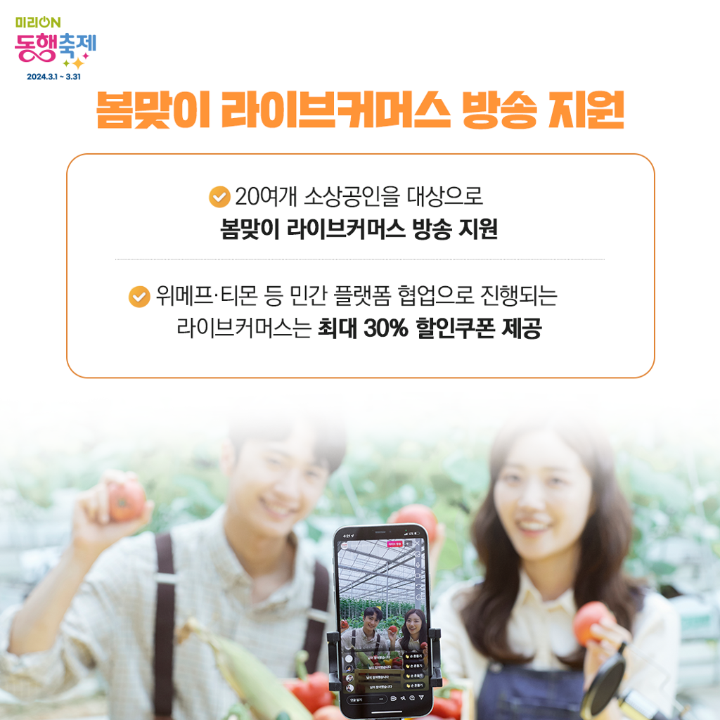약 20개 소상공인을 대상으로 실시간 방송판매(라이브 커머스) 방송도 총 10회 지원합니다. 위메프∙티몬 등 실시간 방송판매는 최대 30% 할인쿠폰을 제공하는 등 소상공인 제품의 판매 활성화에 힘을 보탤 예정이라고 하네요!