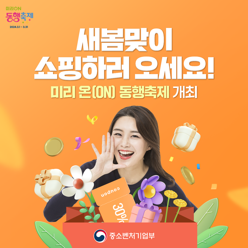 3월부터 중소벤처기업부에서 개최하는 '미리 온(ON) 동행축제' 가 시작됩니다. 소비 진작과 내수 활성화 분위기 조성을 위해 기획된 축제입니다.
