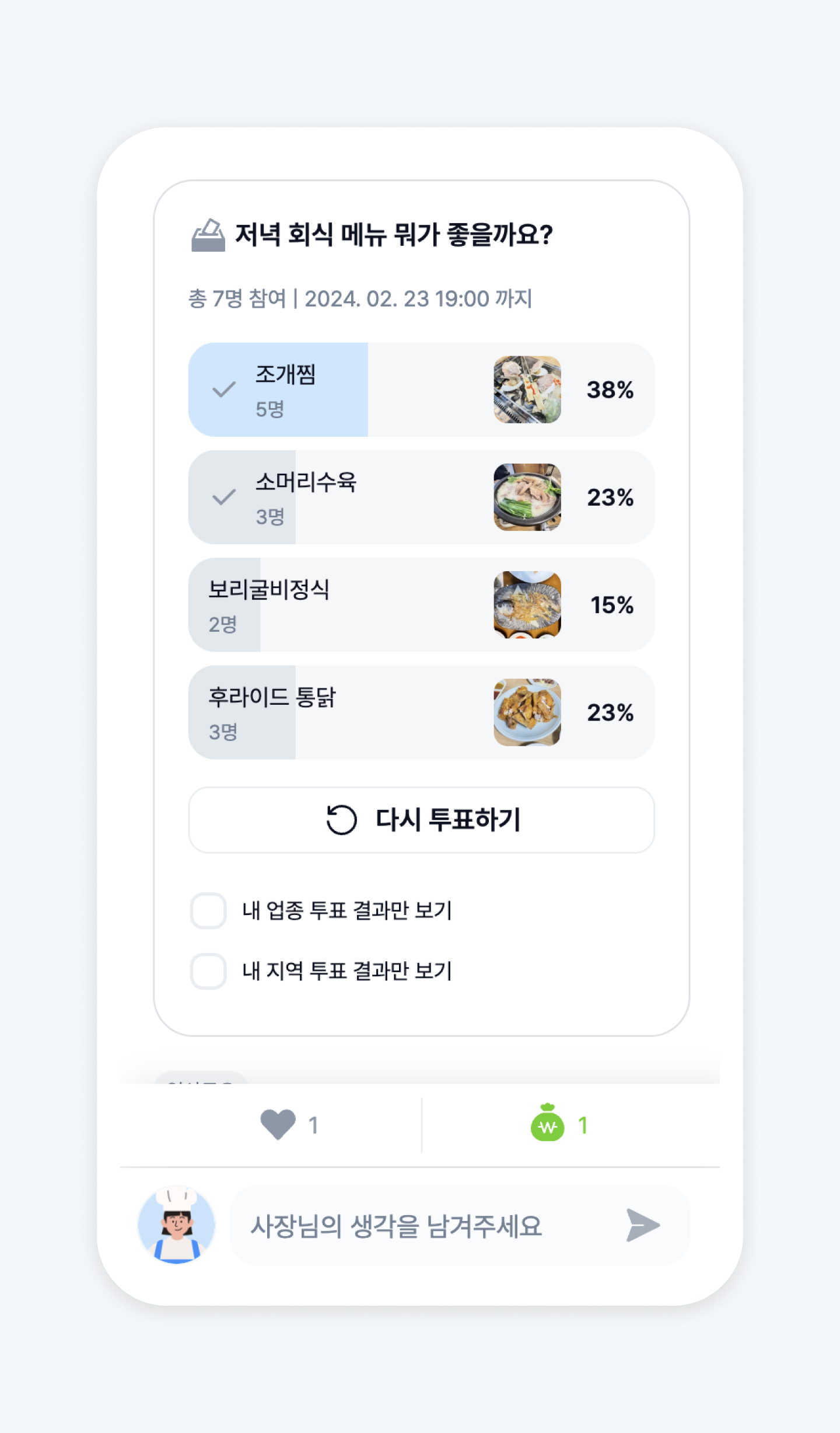 앞으로는 투표 기능을 활용해 간편하게 다른 사장님들의 의견을 구해보세요!