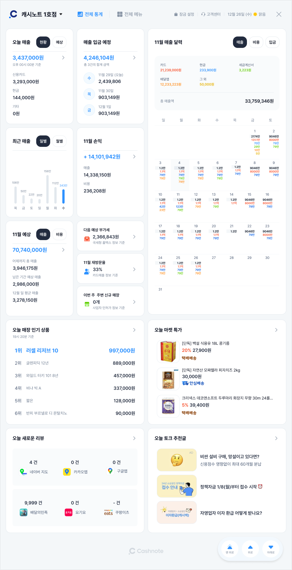 오늘의 영업 실적부터 입금 내역, 다른 사장님과의 교류까지! 이제는 더 큰 화면으로 확인해 보세요.