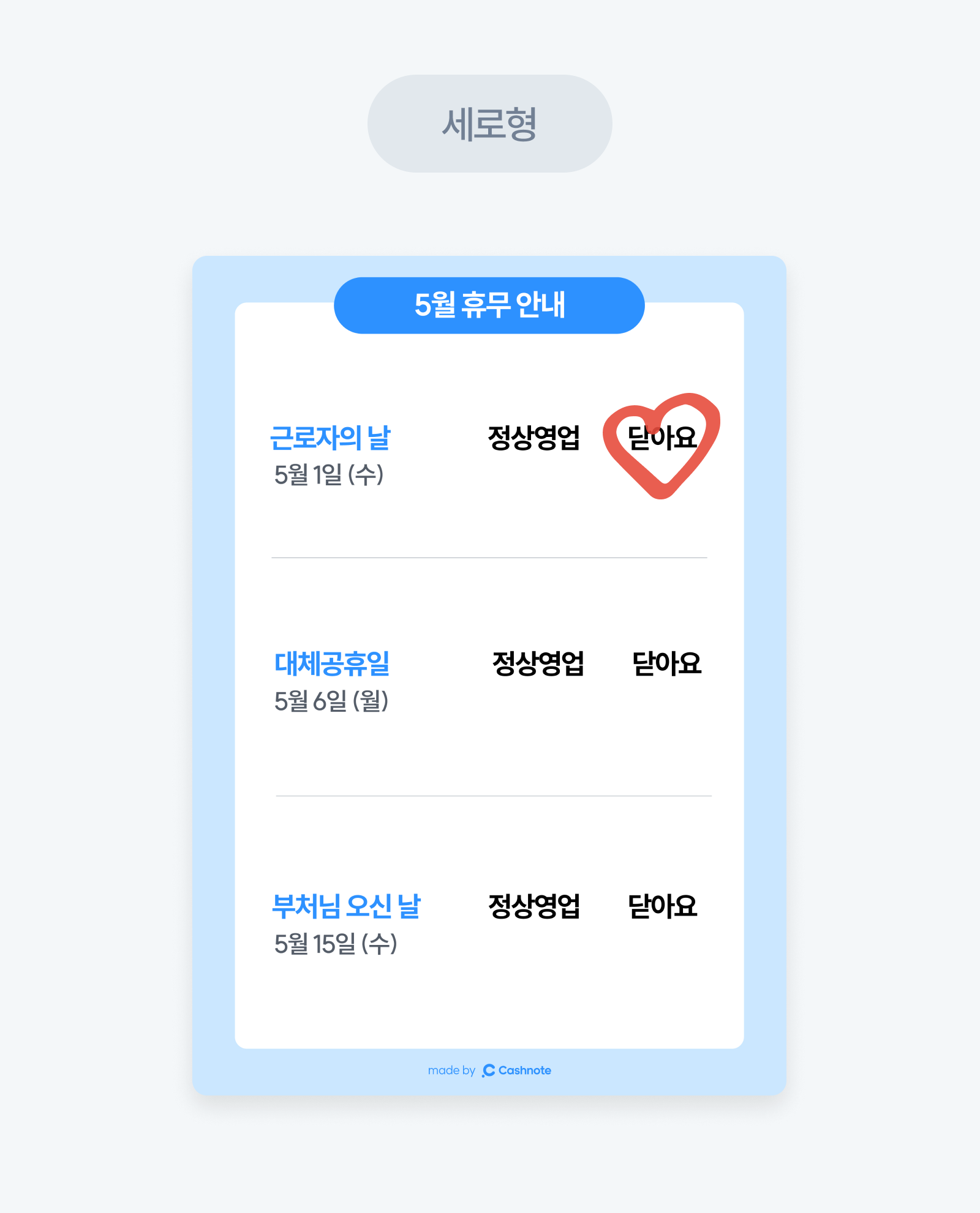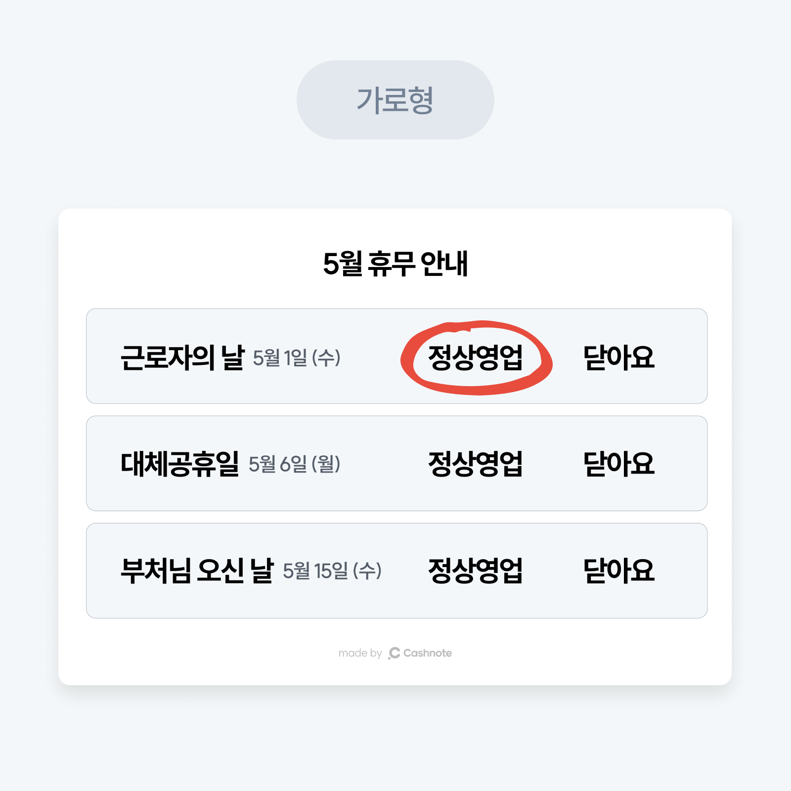 원하는 템플릿을 출력한 후, 정상영업을 하는 날과 닫는 날에 동그라미를 그려주세요!