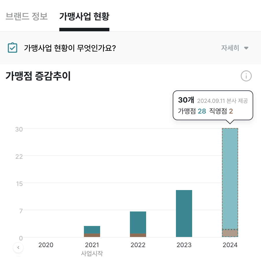 가장 먼저 확인할 부분은 브랜드의 가맹점이 얼마나 늘고 있는지예요. 기본적으로 가맹점 수가 늘고 있다는 건 브랜드가 고객의 사랑을 받고 있다는 증거로 볼 수 있어요. 또 가맹점주 입장에서도 브랜드 파워가 있고 매출이 잘 나오는 브랜드를 오픈하기 원할 것이니 점포 수가 늘어나고 있다는 건 긍정적인 지표입니다.
