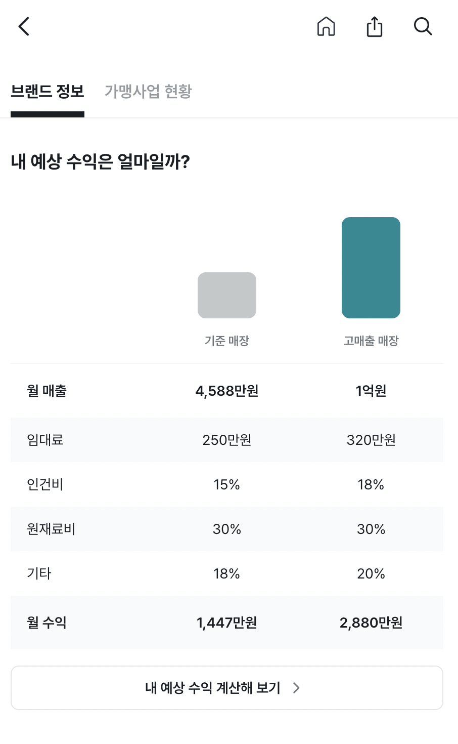 보통 매출이 가장 높은 지점과 가장 낮은 가맹점의 매출 차이는 큰 편이에요. 프랜차이즈 본사에서 예비창업자를 모집할 땐, 당연히 가장 높은 매장의 매출 기준으로 홍보하고 싶을 거예요. 그러니 프랜차이즈 본사에서 말하는 월매출은 참고하시고, 브랜드의 평균 매출을 보세요.