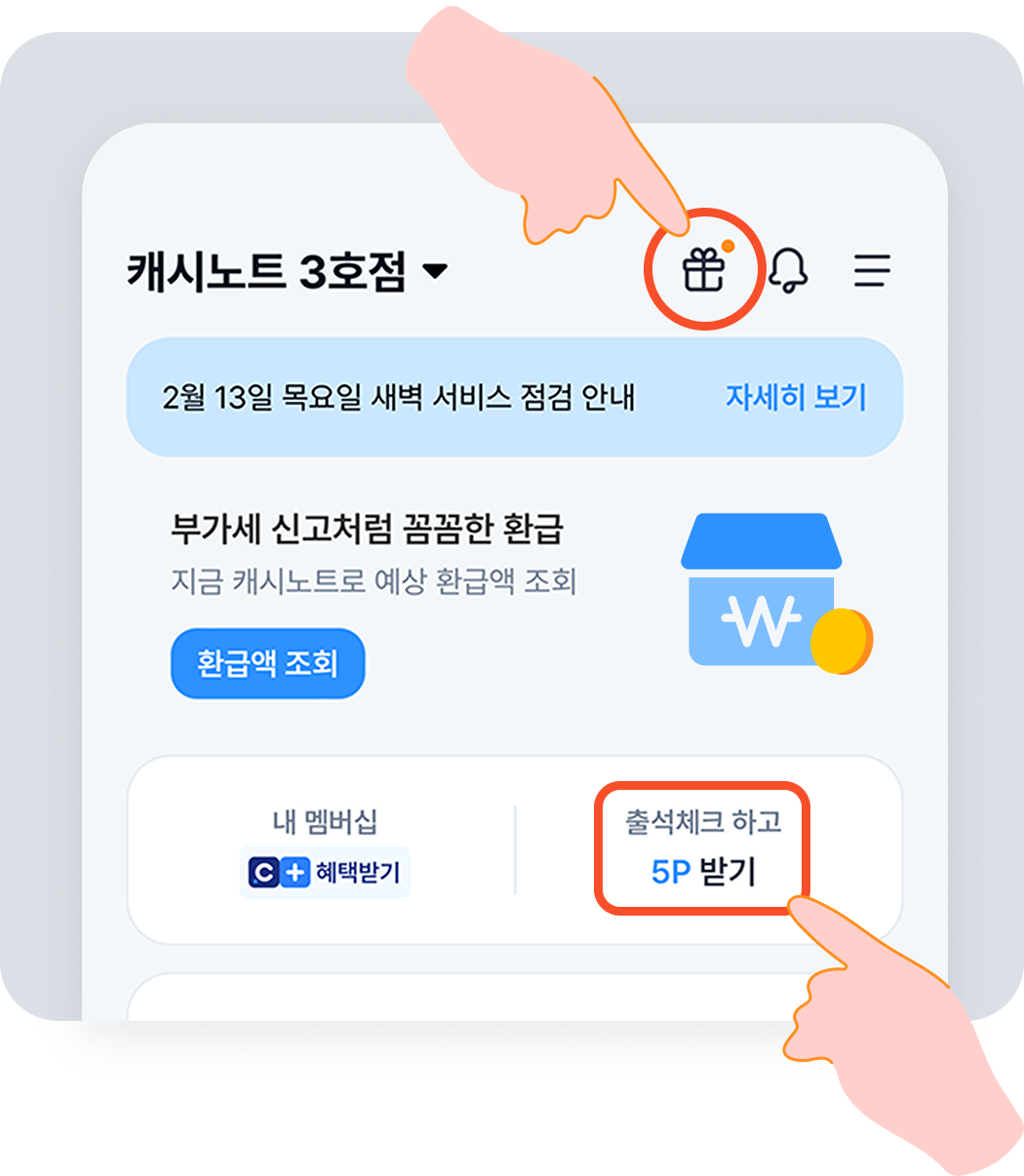 캐시노트 홈 - 선물박스/출석체크 버튼을 클릭하시면 포인트를 적립할 수 있어요.