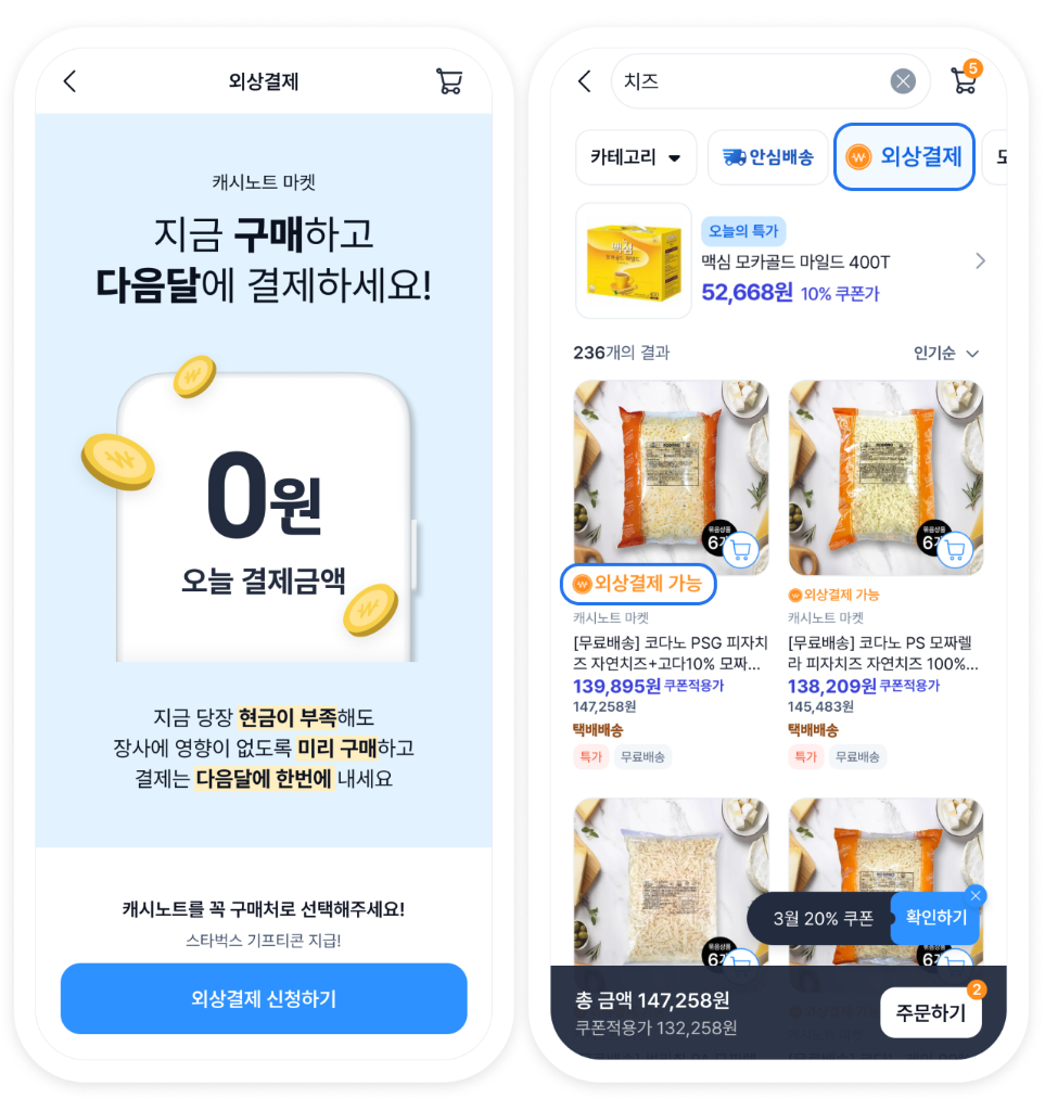 이제부터는 캐시노트 마켓에서 식자재를 외상결제로 부담없이 구매하실 수 있어요!
