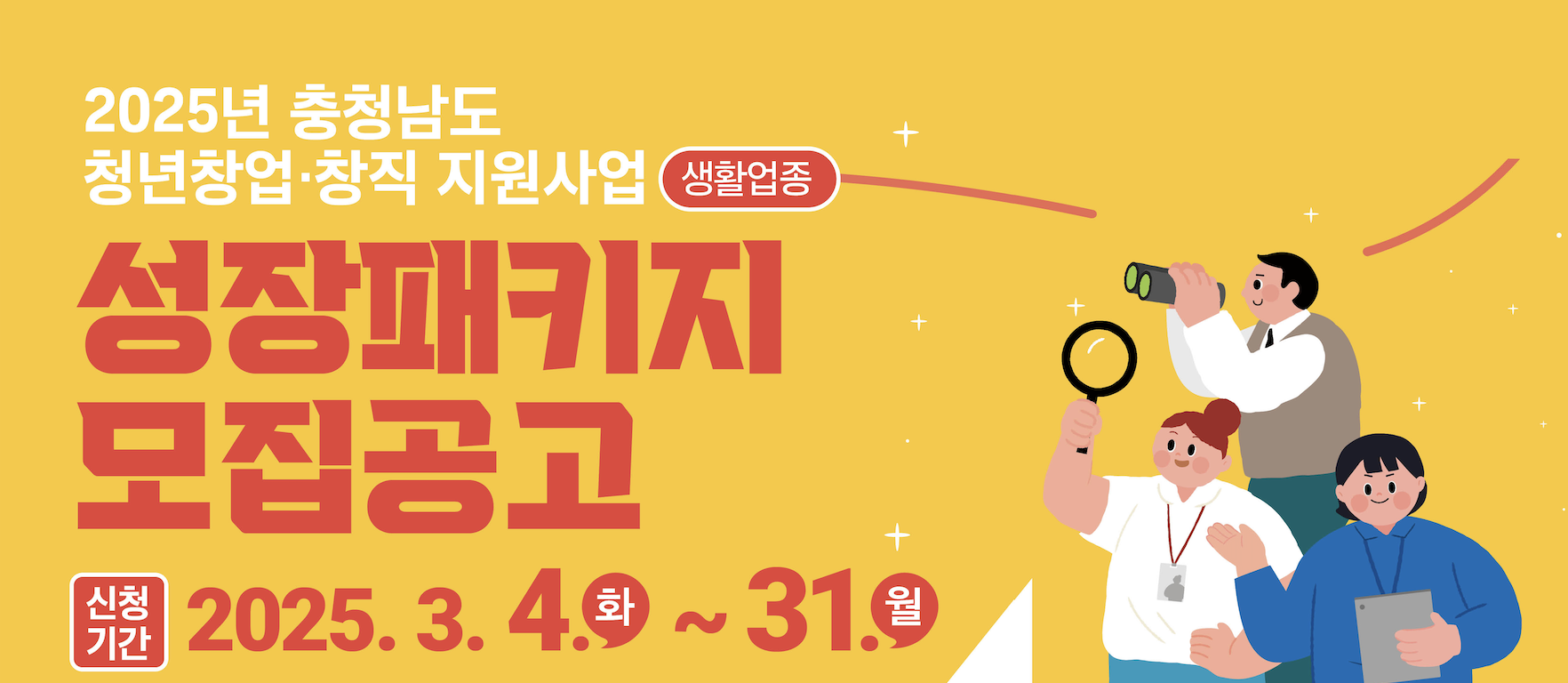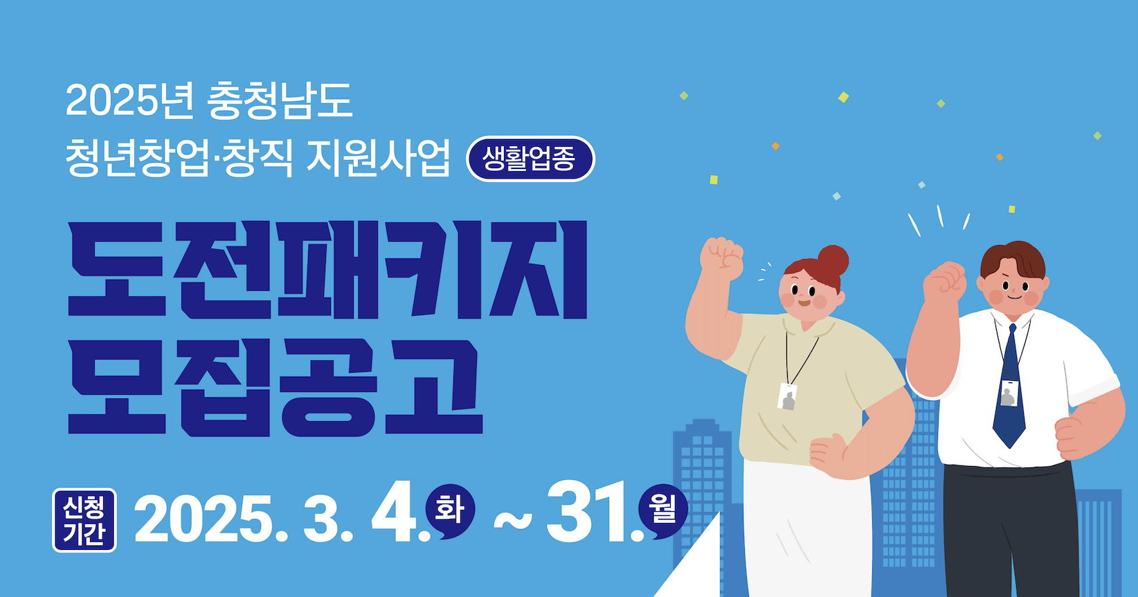 본 콘텐츠는 2025.02.27 충남신용보증재단의 [2025년 충청남도 청년 창업・창직 지원사업(생활업종) 도전패키지 모집 공고], [2025년 충청남도 청년 창업・창직 지원사업(생활업종) 성장패키지 모집 공고]에서 확인한 내용 기준으로 작성하였습니다. 주관사 및 정부 정책에 따라 내용이 달라질 수 있습니다. 조회 시점에 맞춰 최신 정보 확인 부탁드립니다.
