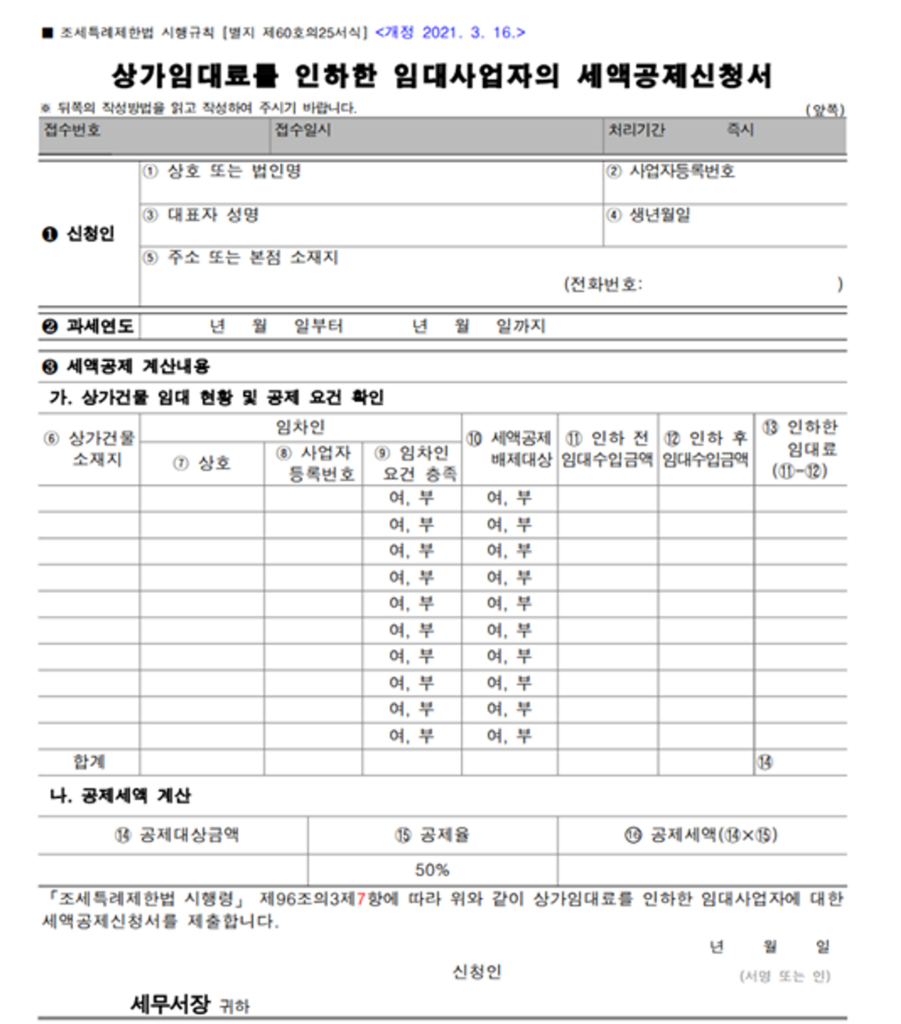 종합소득세 또는 법인세 과세 표준 확정 신고 시 [상가 임대료를 인하한 임대 사업자의 세액 공제 신청서]를 작성하여 세액 공제를 신청해야 합니다.