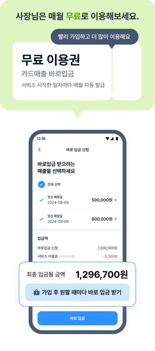 카드매출 바로입금은 사장님들의 원활한 현금 확보를 위해 출시됐어요. 주말과 공휴일 상관없이, 어제 발생한 카드매출을 오늘 바로입금 해드려요.