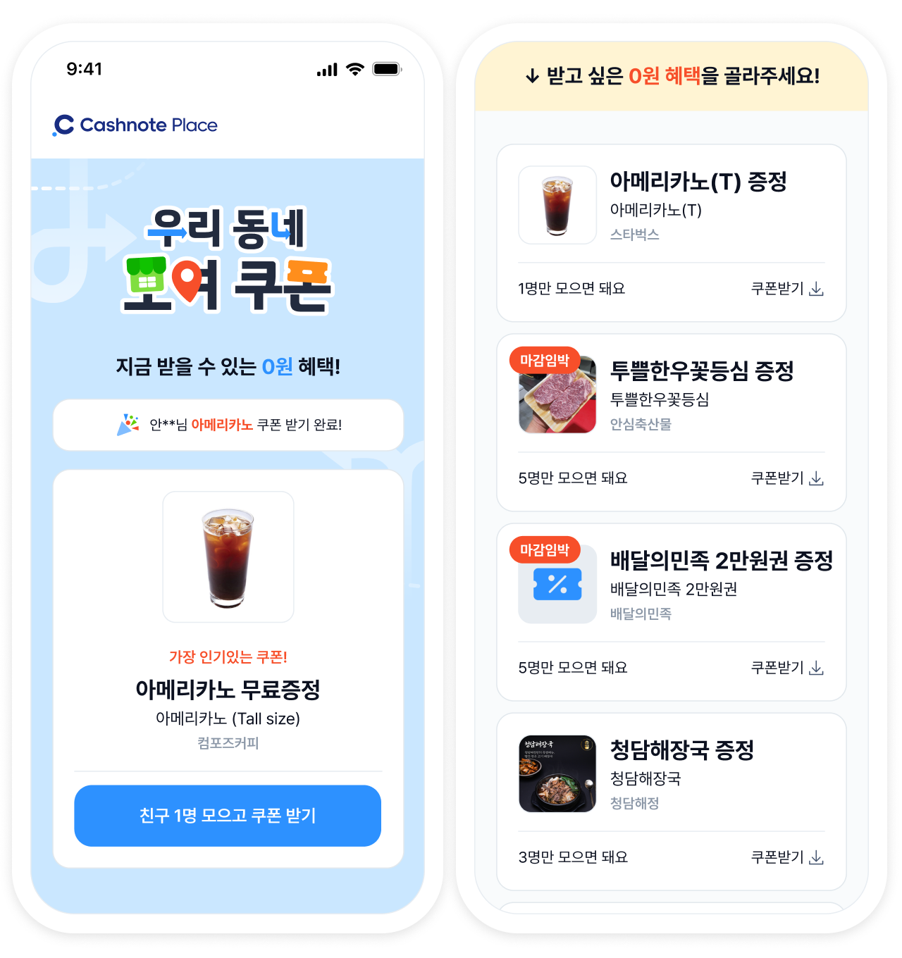 지금 캐시노트 플레이스 가입하고 친구 1명만 초대하면 [선착순] 무료 아메리카노*를 드려요.