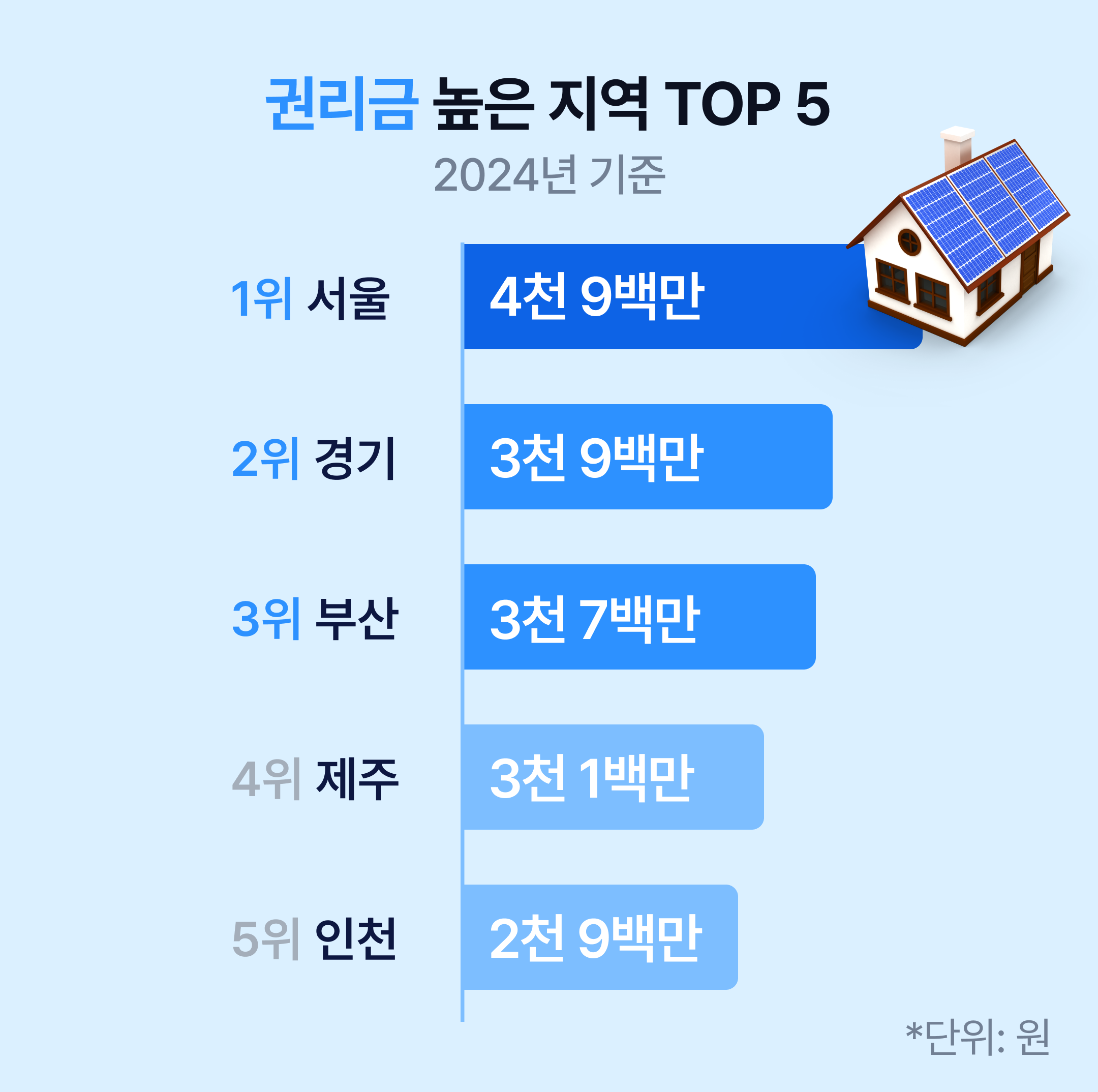 수도권 지역이 TOP5에 모두 포함되며, 그 외 비수도권 중 제주, 부산이 권리금 상위권에 속했어요.