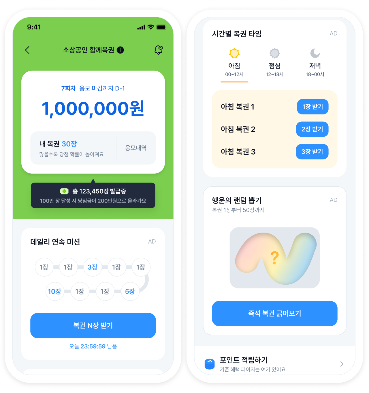 지금 바로 새로워진 복권 미션에 참여하고 다음주 100만 원 당첨의 주인공이 되어보세요!