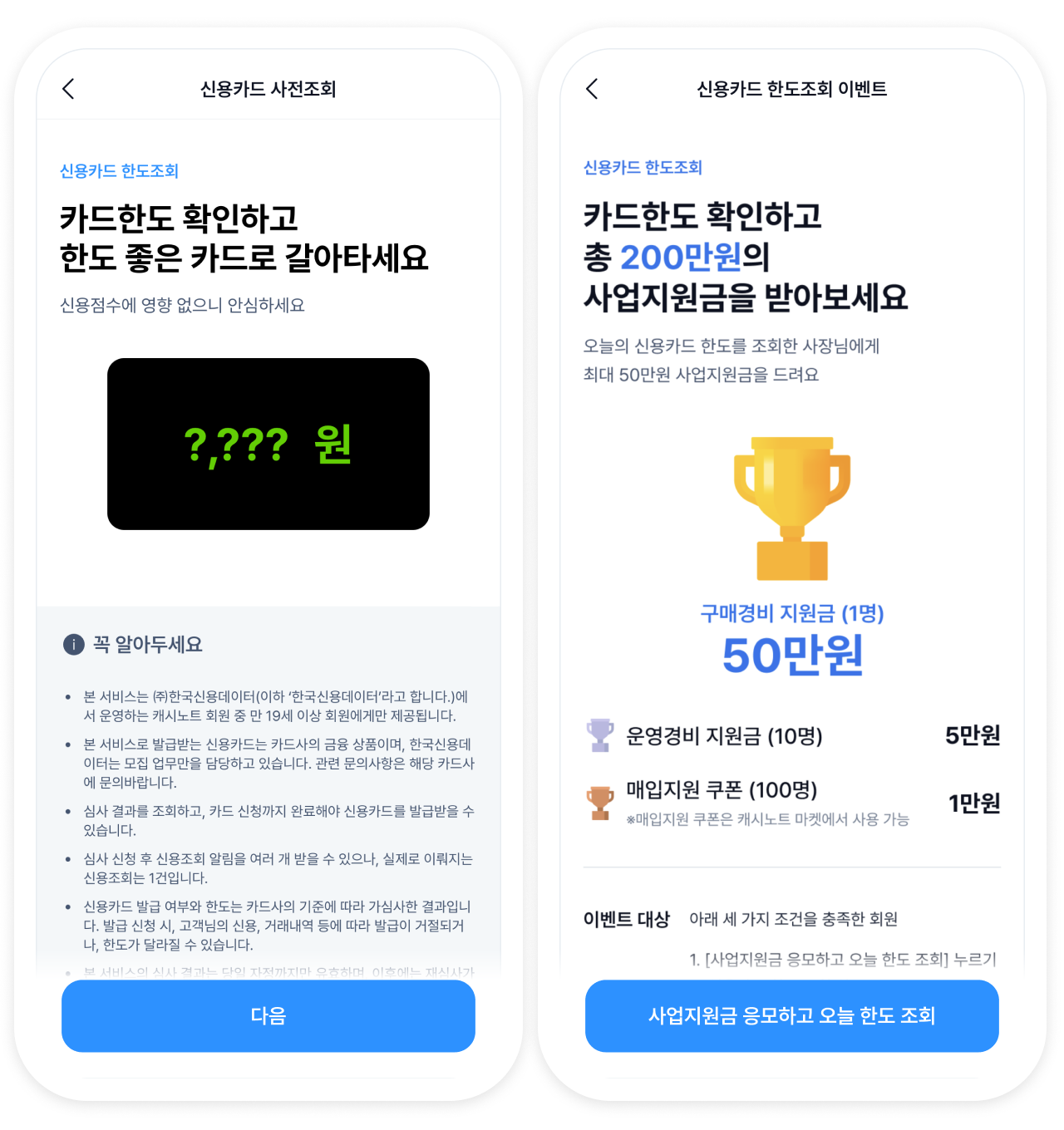 이번 달 한도 조회만 해도 총 200만 원의 사업지원금 당첨의 기회까지! 1분 만에 조회하고 한도 좋은 카드로 지금 갈아타세요.