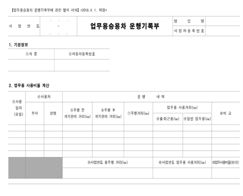승용차 관련 비용이 연간 1,500만원을 초과할 경우(부동산 임대업자는 500만원), 초과 금액을 비용 처리하여 공제 받으려면 운행 일지를 작성해야 합니다.