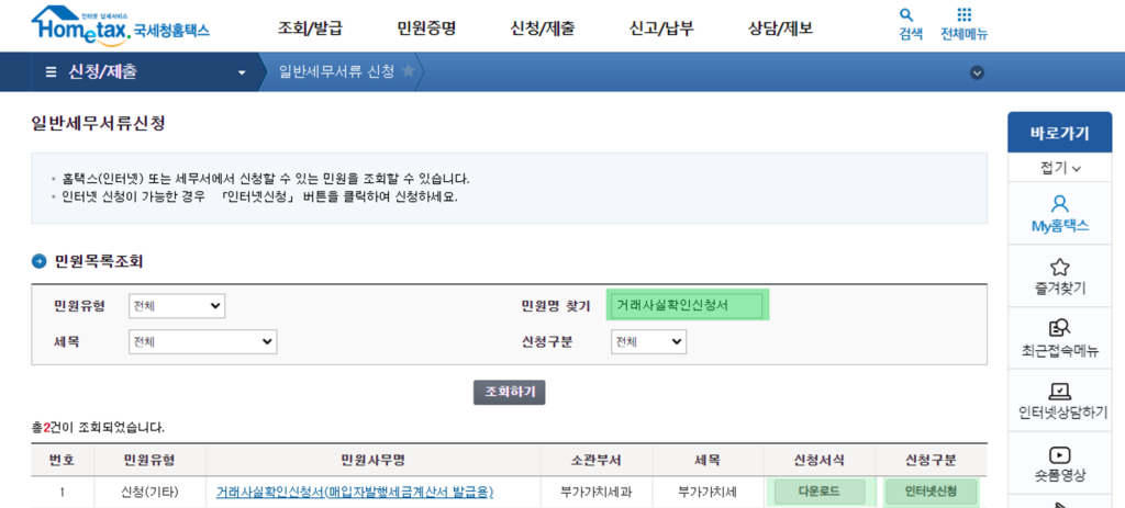 [민원명 찾기]에 “거래사실확인신청서” 검색 후, [다운로드] 클릭
