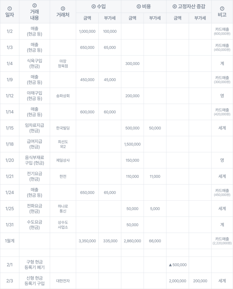 1일에 매출로 잡히는 건수가 수십 개라면 매출을 하나하나 다 기록하기가 너무 번거롭겠죠. 그래서 간편장부에서는 1일 매출 건수가 평균 50건 이상일 시 1일 동안의 총 매출액을 1건으로 합계하여 기록할 수 있습니다. 김삼겹 씨도 1월 2일의 매출을 하나로 합계하여 110만원으로 기재했네요.