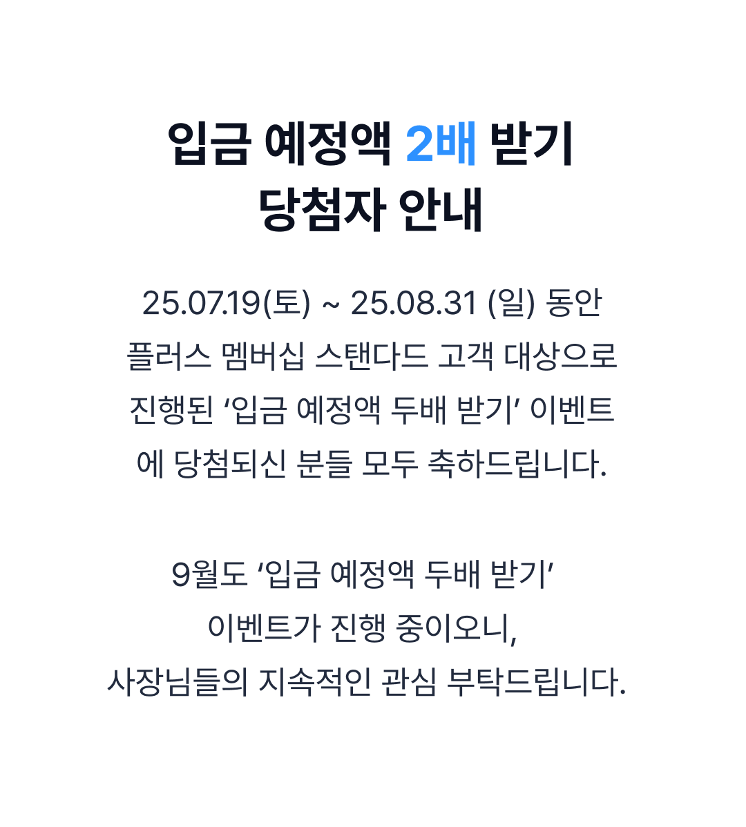 [당첨 발표] 7-8월 스탠다드 고객 대상 입금 예정액 2배 받기 이벤트
