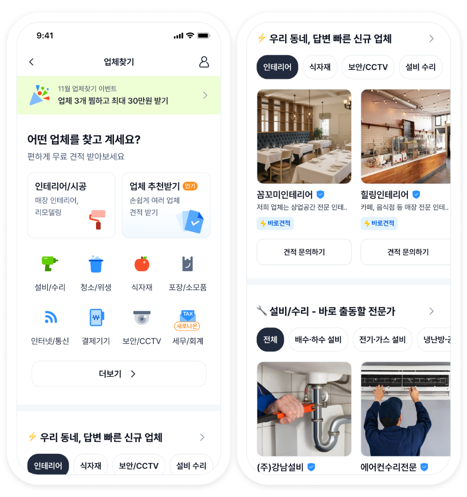 매장에 필요한 설비/수리 업체 찾으세요!