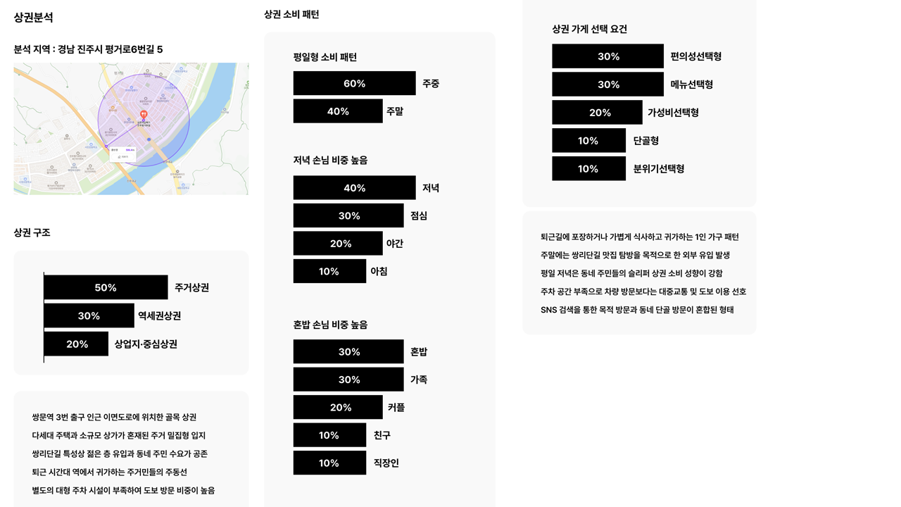 상권 분석 뿐만 아니라 매출과 네이버 유입량, 키워드 검색량 등의 데이터를 모아서 전체적인 마케팅 전략을 제시해주는 AI입니다.