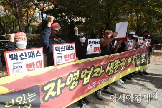 [포토]백신패스 반대 구호 외치는 대한자영업자연합회
