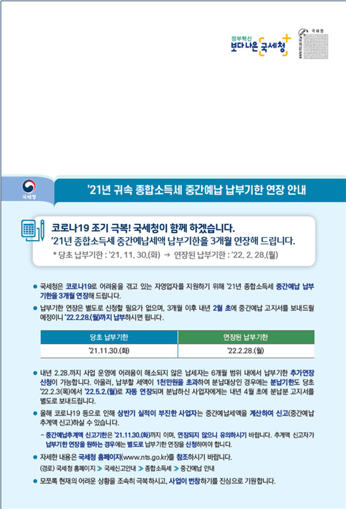 코로나 피해입은 영세소상공인 등 136만명, 종합소득세 납부 내년 2월로 연장
