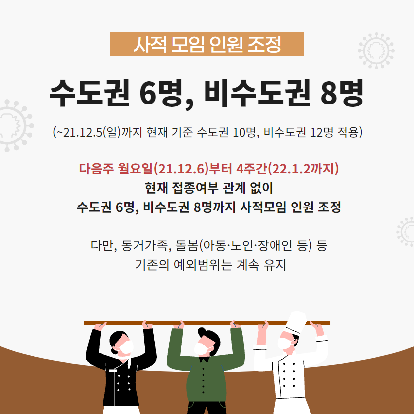 마스크 착용이 어려운 식당·카페에 대하여 방역패스를 적용하되, 필수 이용시설 성격이 큰 점을 감안하여 사적모임 범위 내에서 미접종자 1명까지는 예외 인정.