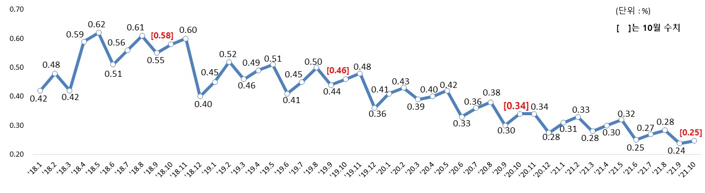 10월말 은행 연체율 0.25%…코로나19 만기 연장 '착시'도