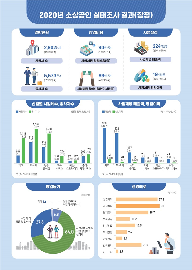 지난해 코로나 한파 속 숙박·음식점 늘었지만 종업원·매출은 '뚝'↓