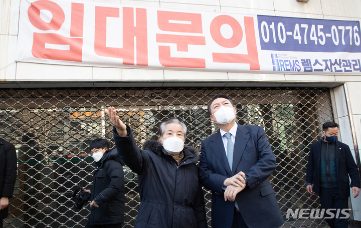 임대문의 붙은 코로나19 피해 관련 음식점 밀집지역 찾은 윤석열 대선 후보